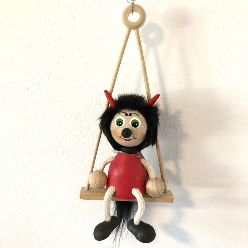 Dřevěný čertík sedící na houpačce, opatřený pružinou a určený k zavěšení.