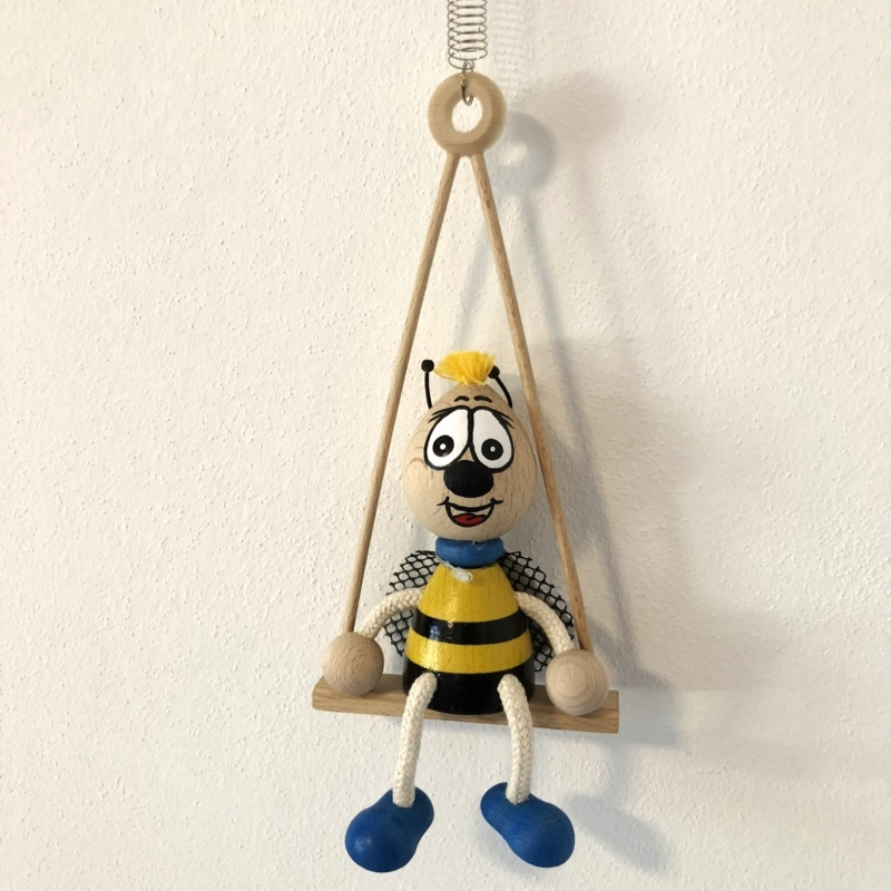Dřevěný čmelák sedící na houpačce, opatřený pružinou a určený k zavěšení.