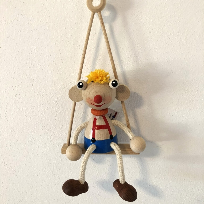 Dřevěný okatý kluk sedící na houpačce, opatřený pružinou a určený k zavěšení.