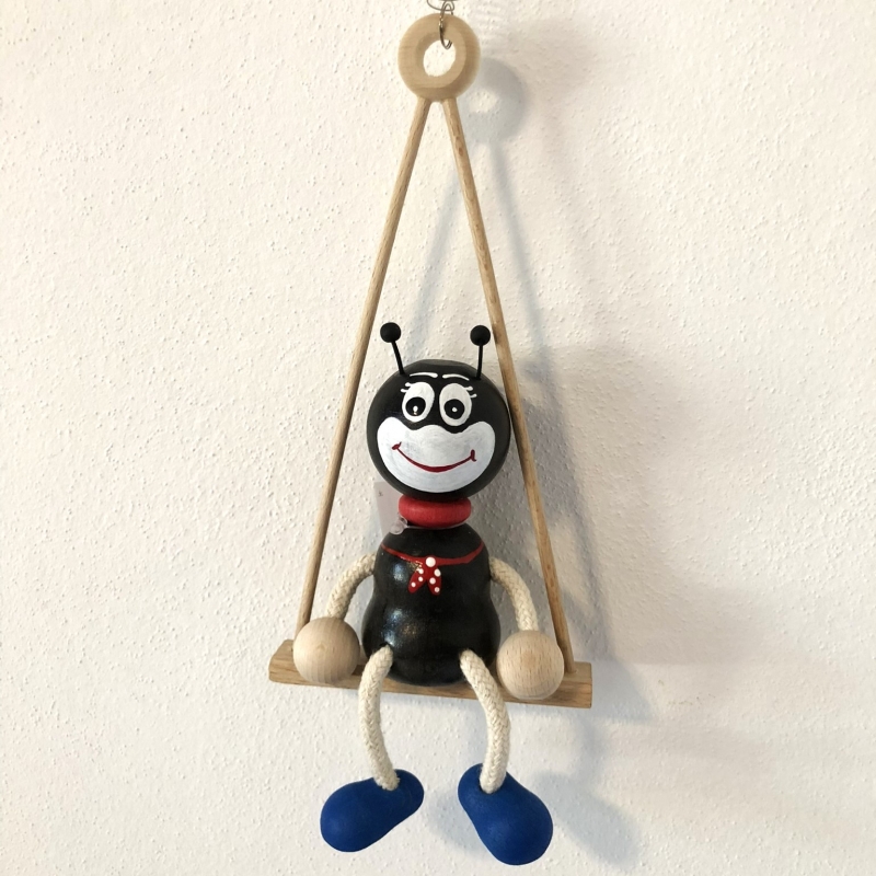Dřevěný mravenec sedící na houpačce, opatřený pružinou a určený k zavěšení.