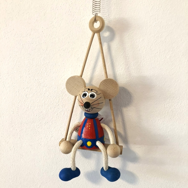 Dřevěná myška sedící na houpačce, opatřená pružinou a určená k zavěšení.