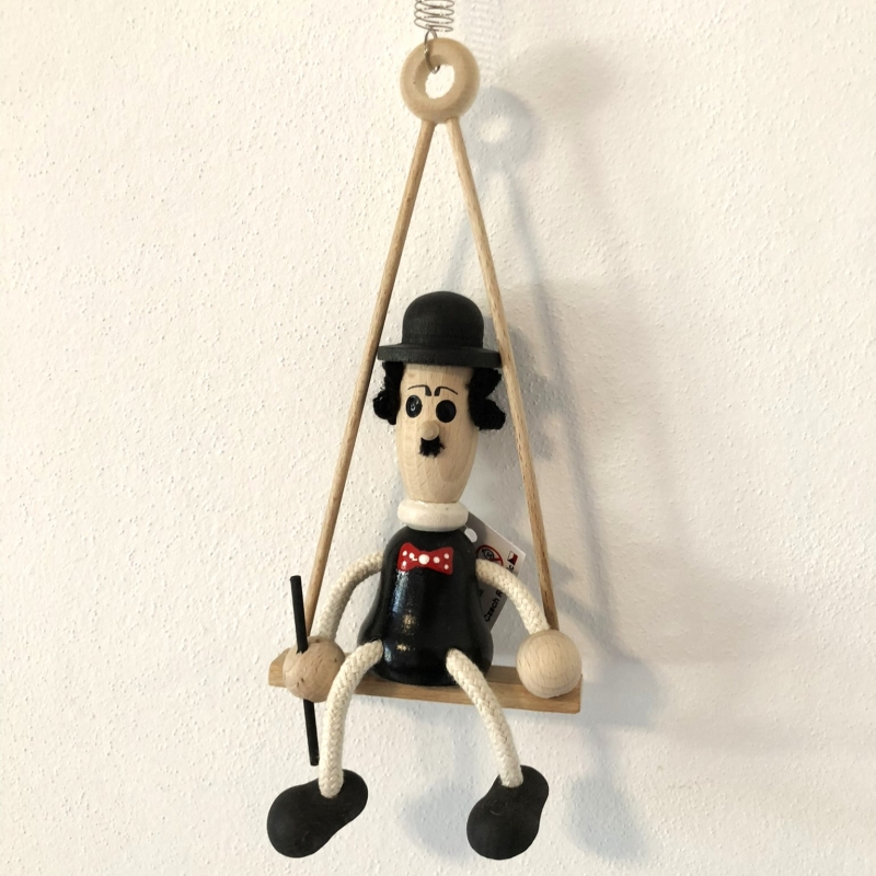 Dřevěný pán s hůlkou, sedící na houpačce, opatřený pružinou a určený k zavěšení.