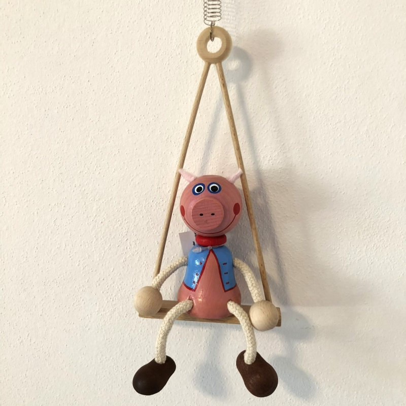 Dřevěné prasátko sedící na houpačce, opatřené pružinou a určené k zavěšení.