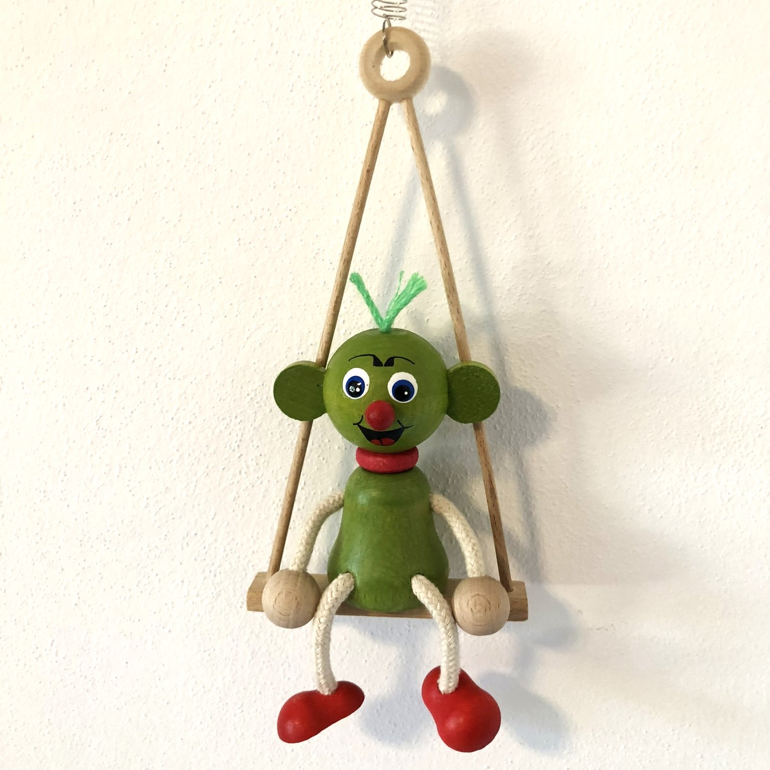 Dřevěný panáček Rákosník sedící na houpačce, opatřený pružinou a určený k zavěšení.