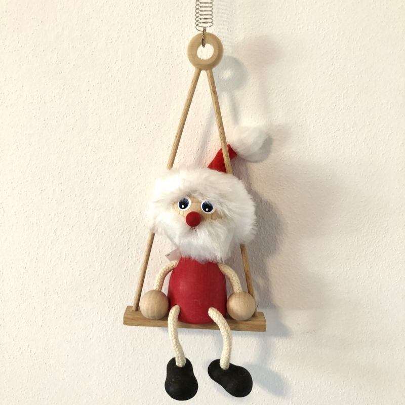 Dřevěný panáček Santa Clause, sedící na houpačce, opatřený pružinou a určený k zavěšení.