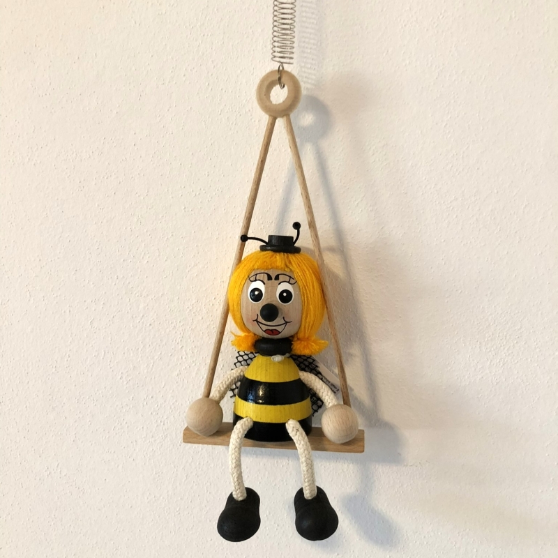 Dřevěná včelka sedící na houpačce, opatřená pružinou a určená k zavěšení.