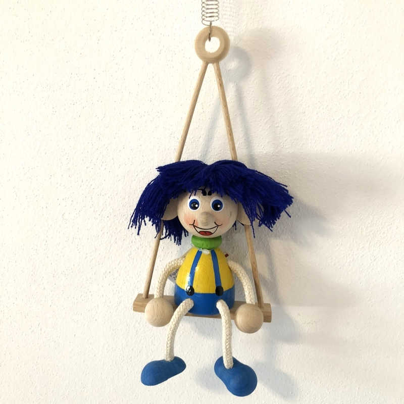 Dřevěný panáček vlasatce s modrými vlasy, sedící na houpačce, opatřený pružinou a určený k zavěšení.