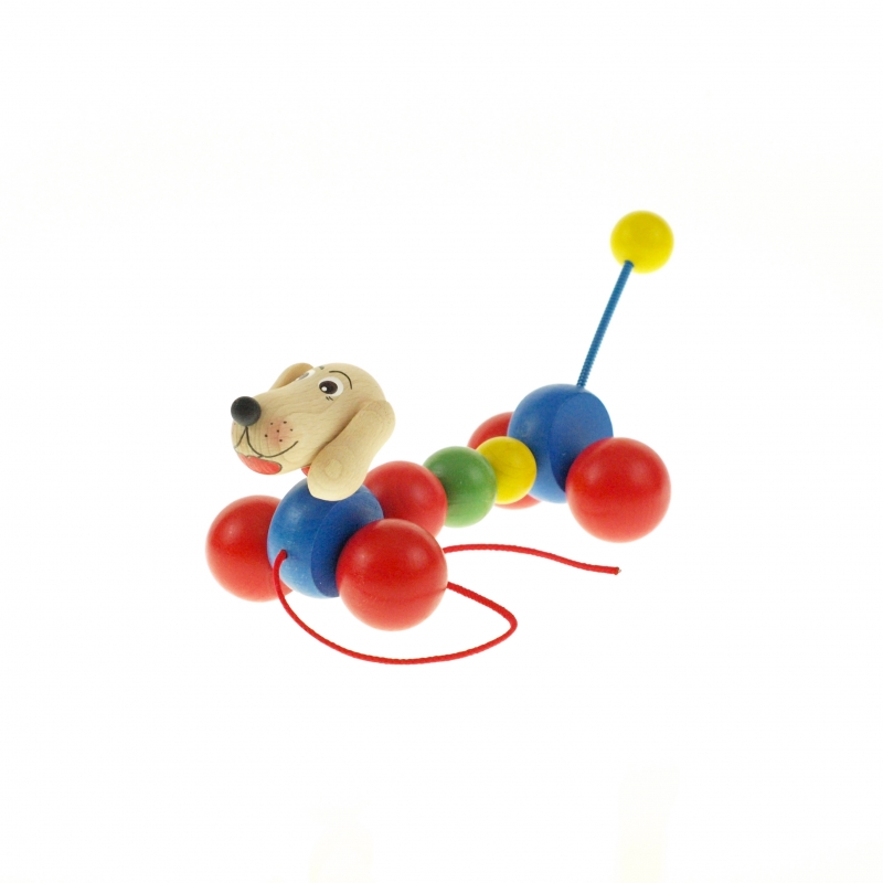 dřevěný barevný pejsek na kolečkách, který při pohybu klape
