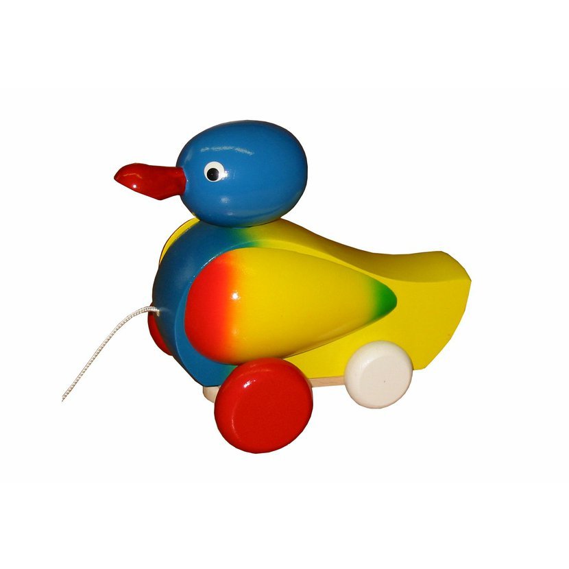 Dřevěný tahací kačer s modrou hlavou, který při pohybu vydává klapací zvuk, otáčí hlavičkou doprava a doleva a zvedá křídla nahoru a dolů. Tato hračka je ideální pro malé děti.